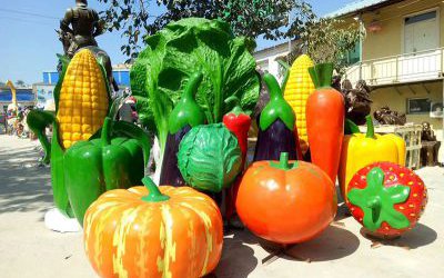 玻璃鋼蔬菜雕塑一般制作成仿真蔬菜、瓜果樣式,用于農家院、產銷地、庭院園林等地方。可以無限放大定制成大型景觀;也可以結合籃子定做成蔬菜籃子造型;還可以進行卡通化設計,加工成可愛的卡通造型。